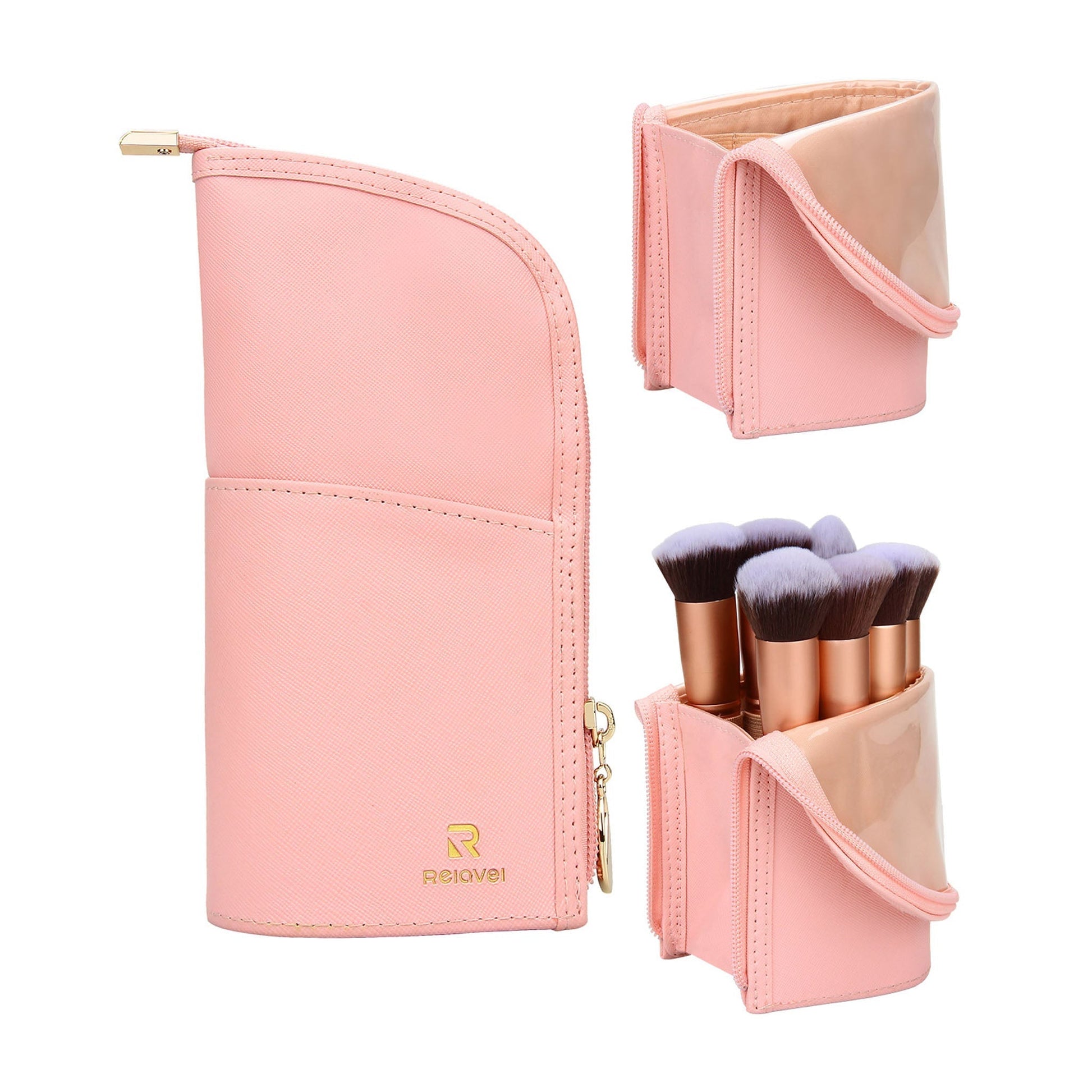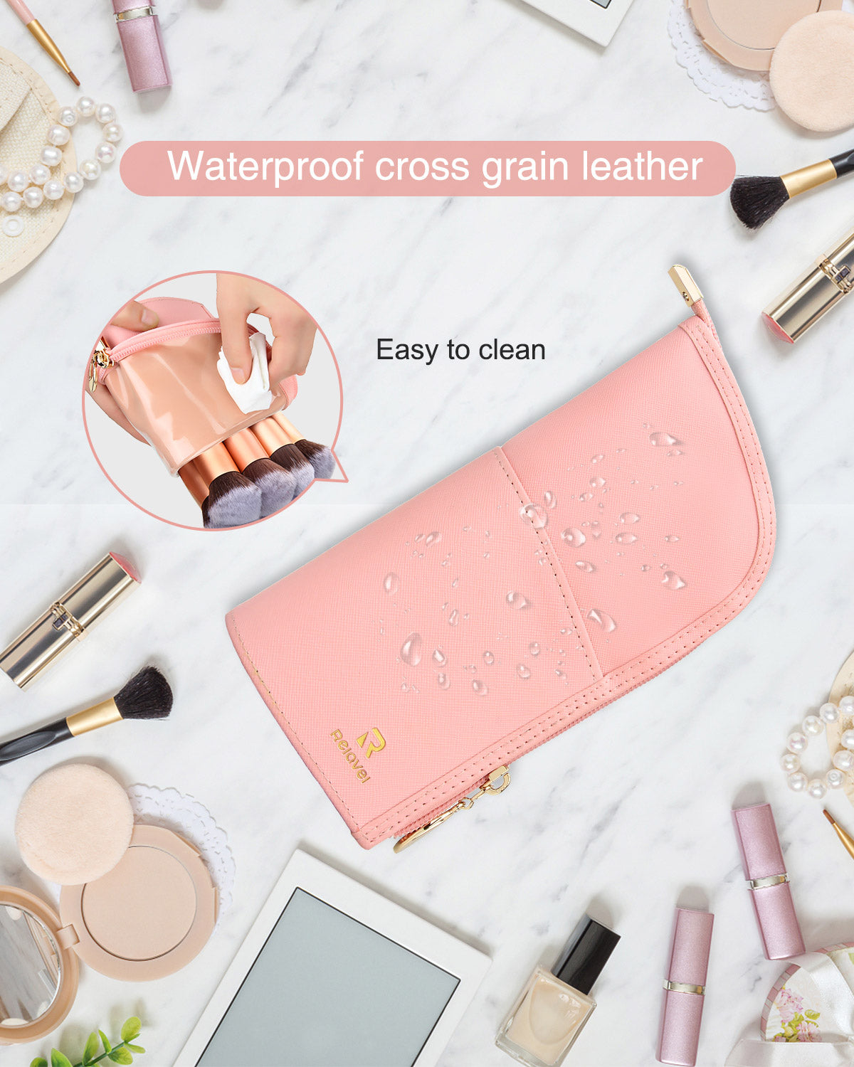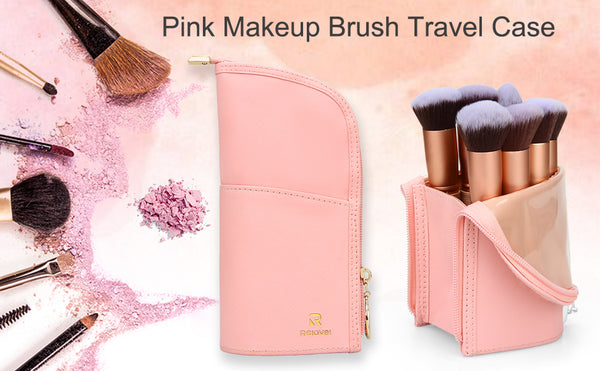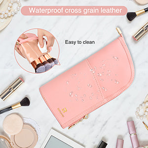 This pink makeup brush bag is made of high-quality PU leather and is equipped with a smooth golden zipper. This material makes this bag excellent waterproof, wrinkle-resistant and easy to clean.
