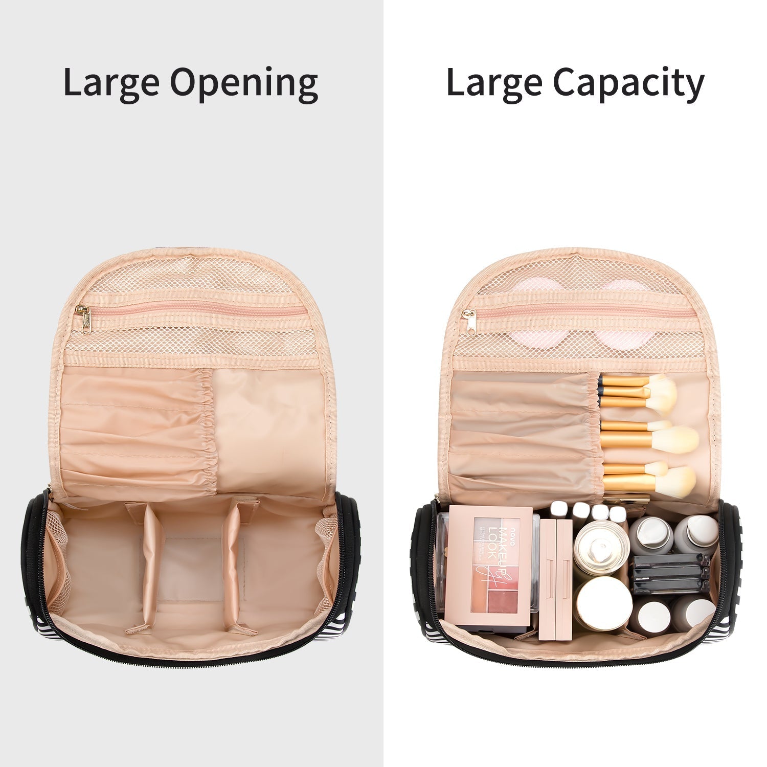 - Our cosmetic bag with large opening zipper on top make it easy to pack, perfect design, easy to place all cosmetics, skin care products, makeup brushes, makeup tools.