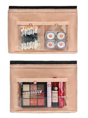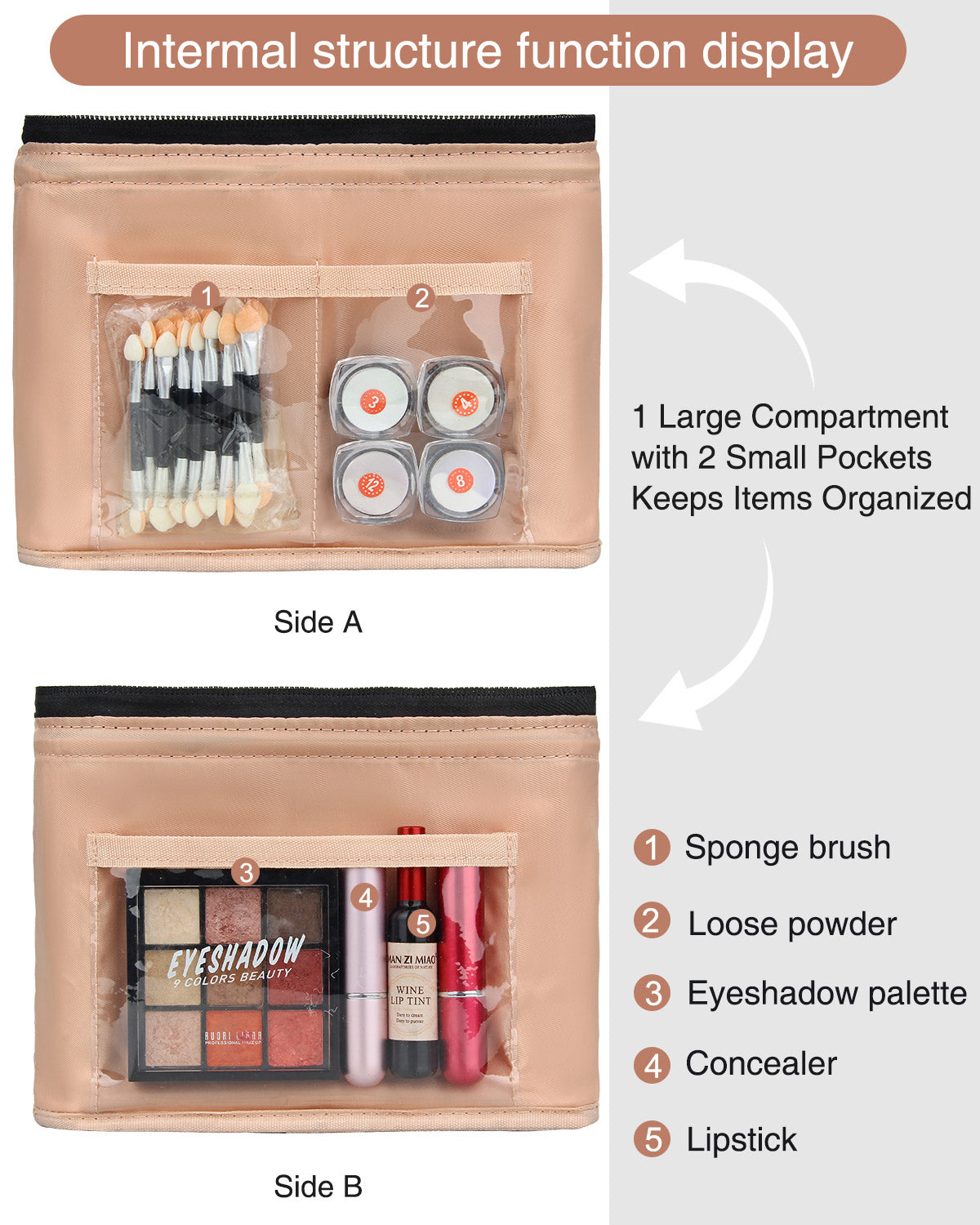 • Internal multi-transparent compartment --One main compartment with 3 small pockets neatly organizes your makeup. One large compartment easily holds travel-size toiletries or large skin-care products. pvc Transparent compartment pockets holds your concealer, lipsticks or other small items.