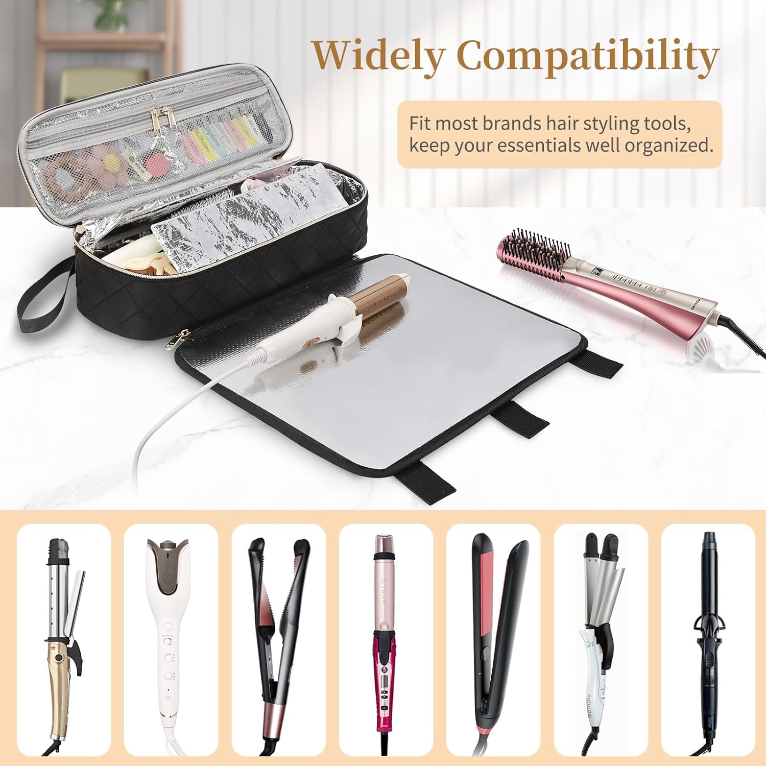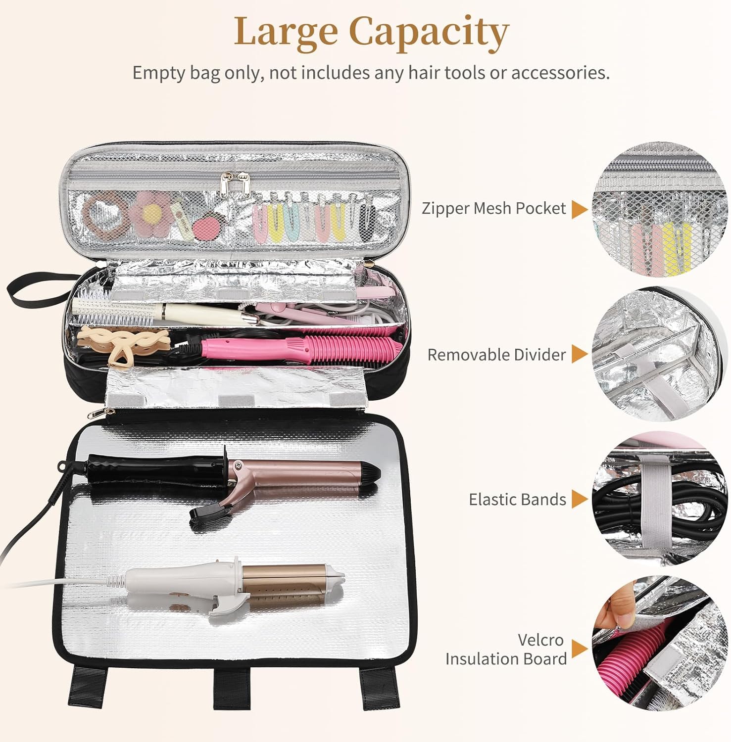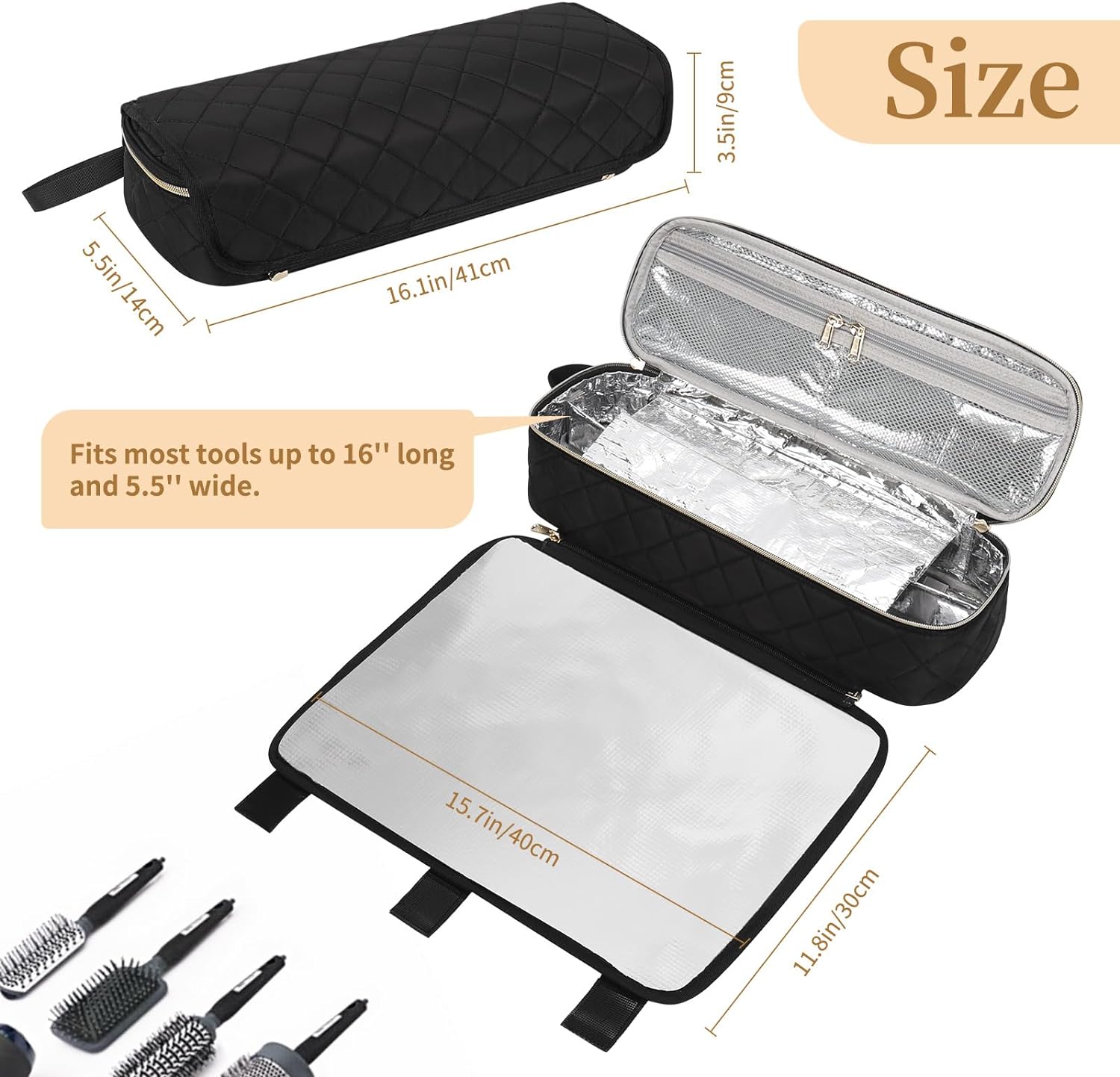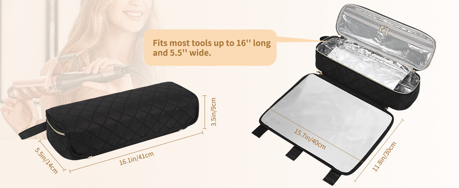 - 〖2-in-1 Hair Tools Travel Bag〗——Unique 2-in-1 design, hair tools bag and heat resistant mat are designed in one bag, can hold your whole set of hair styling tools, such as curling irons, hair straighteners, curling wands and other styling tools. Please check size, fits most tools up to 16'' long and 5.5'' wide.