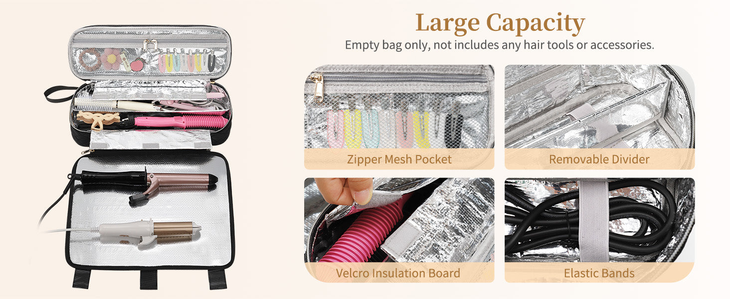 - 〖Large Capacity〗—— Size 16.1'' L x 5.5'' W x 3.5'' H, spacious opening with double zippers for easy access, providing ample space to accommodate various hair styling tools. Inside two zipper mesh pockets and detachable partition keep your travel essentials organized well, and two elastic bands can fix the cables of hair tools well.