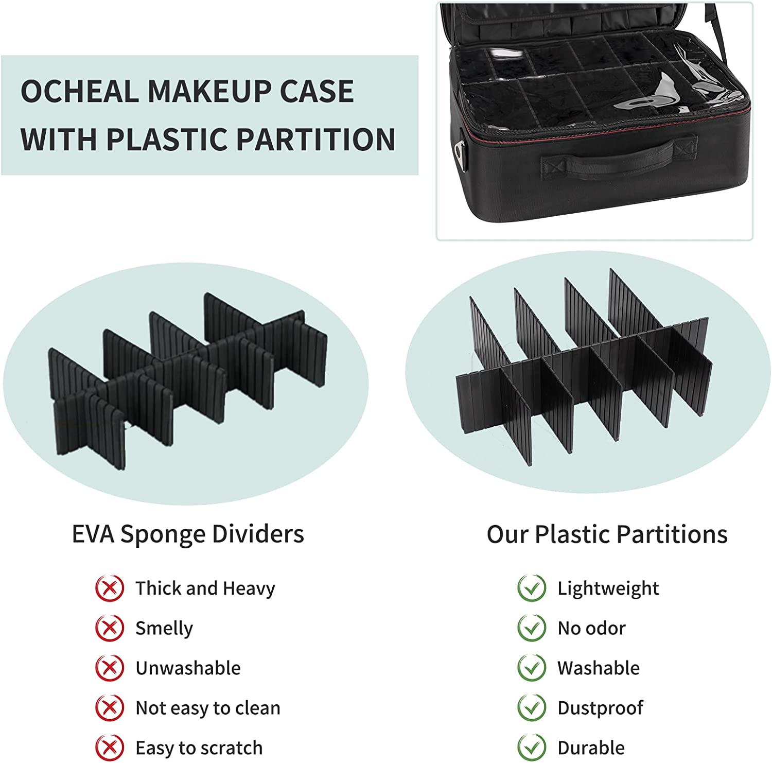 - Adjustable Partition: Different from other large travel makeup case, this partition is made of plastic,Plastic partitions are not easy to get dirty which will easy to wipe and clean.Each partition is matched with the card slot, which can be inserted and taken out well.and keep your cosmetics neat and tidy as well.