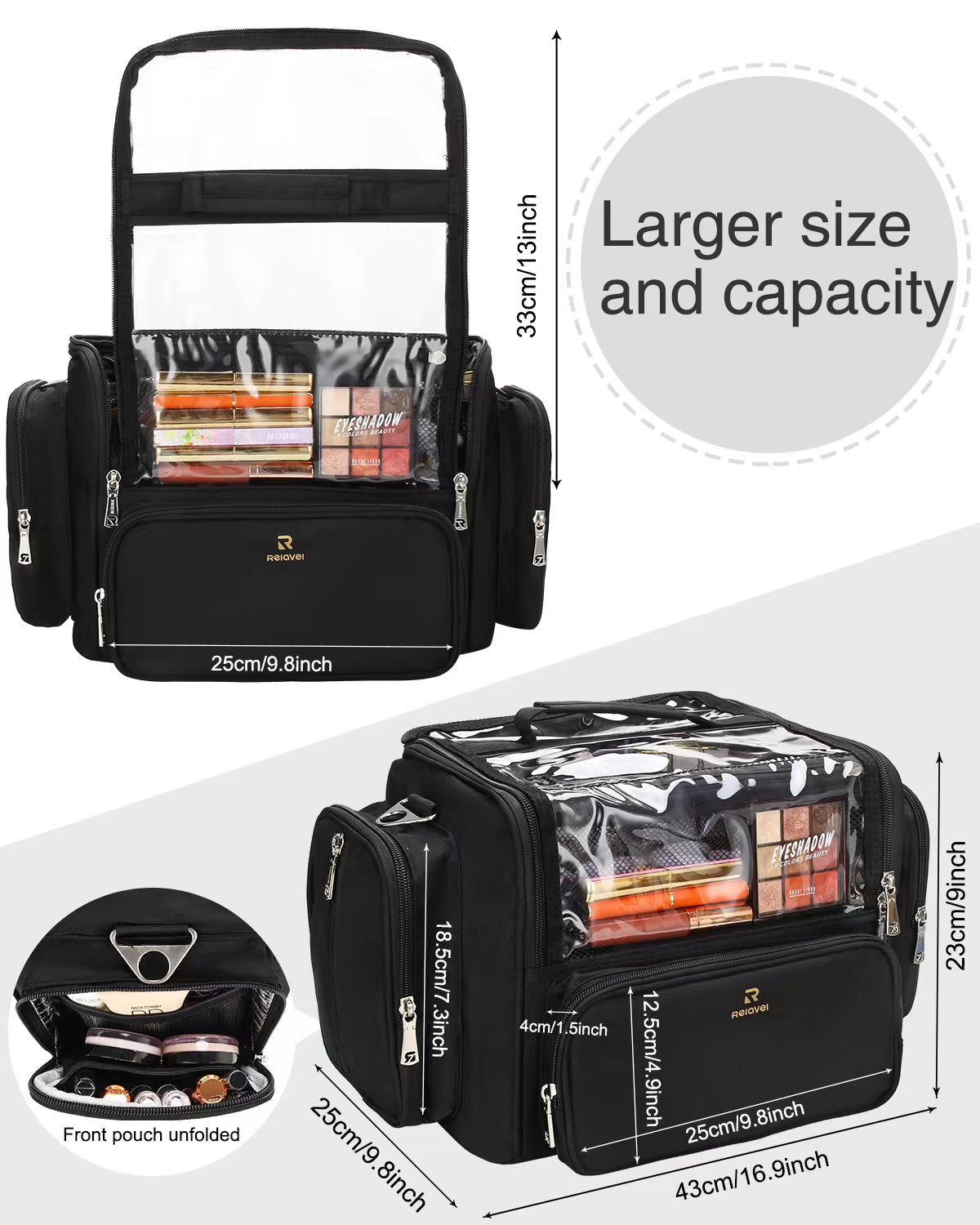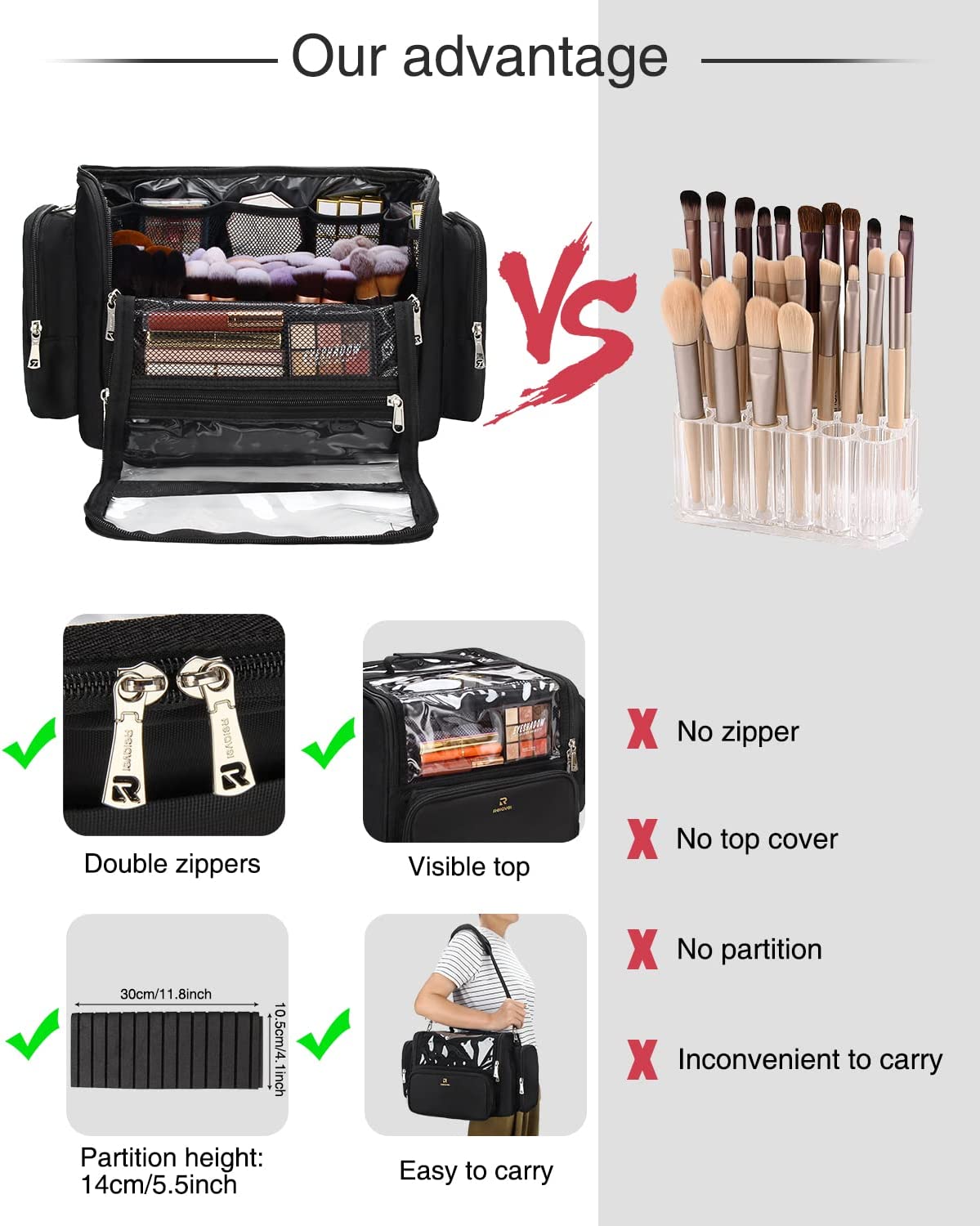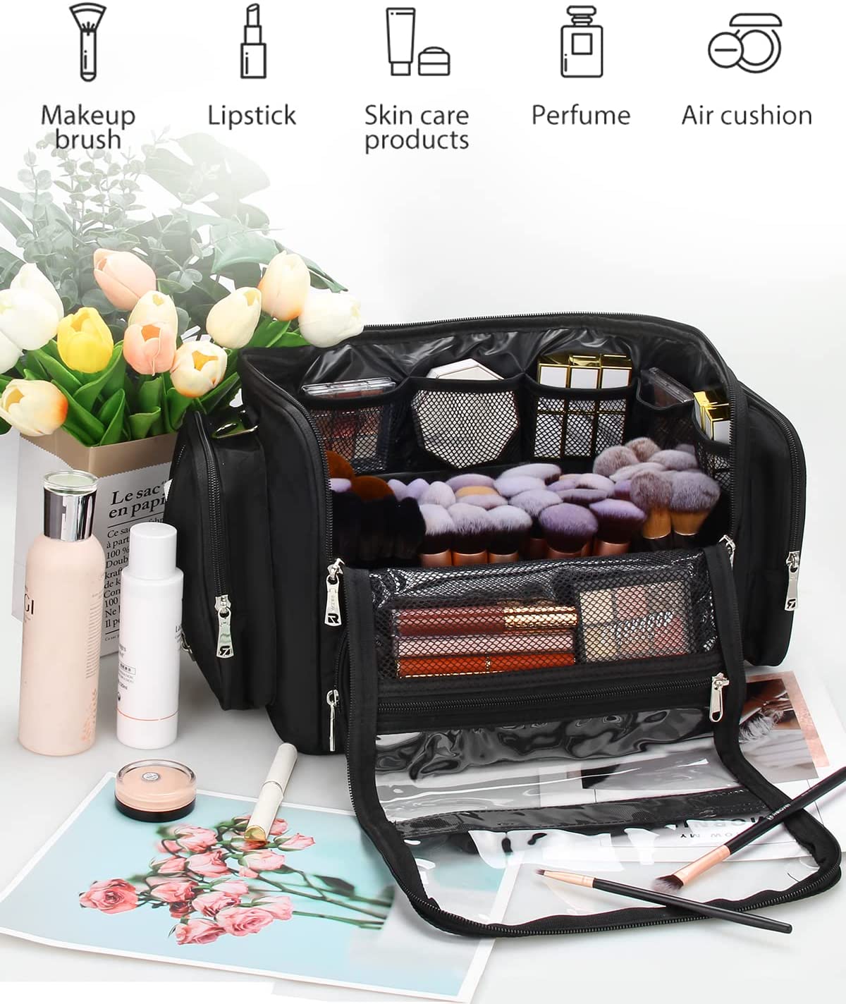 Makeup Brush Case, Extra Large Makeup Brush Holder Black Professional Makeup Artist Travel Bag, Clear Waterproof Cosmetic Organizer Bags, Full Open, with Adjustable Strap and Dividers