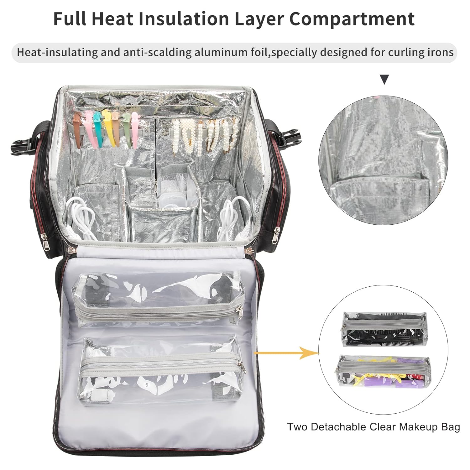 Large Makeup Train Case,Cosmetic Makeup Case for Hairstylist, Hairdresser Bag with Detachable Pouch,Heat Insulation and Anti-scalding Full layer for Hairdressing Tool Organizer Trolley with wheels
