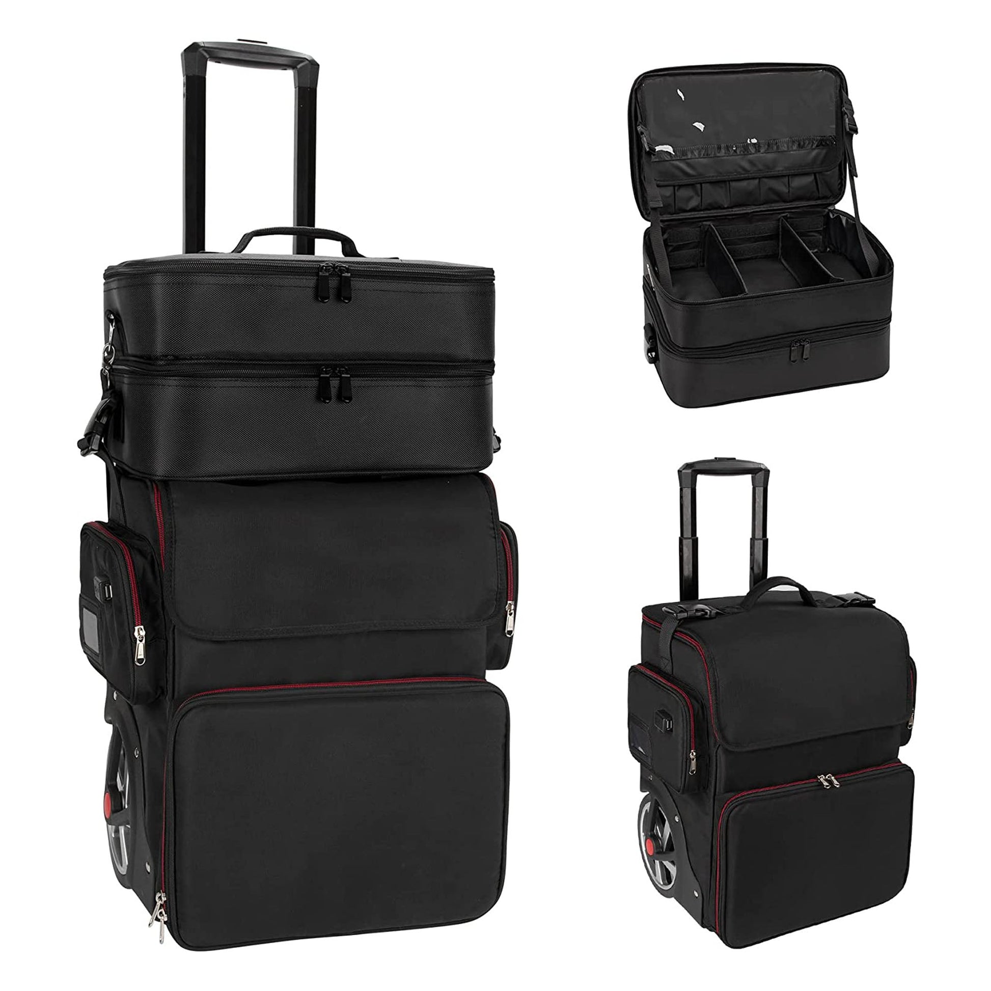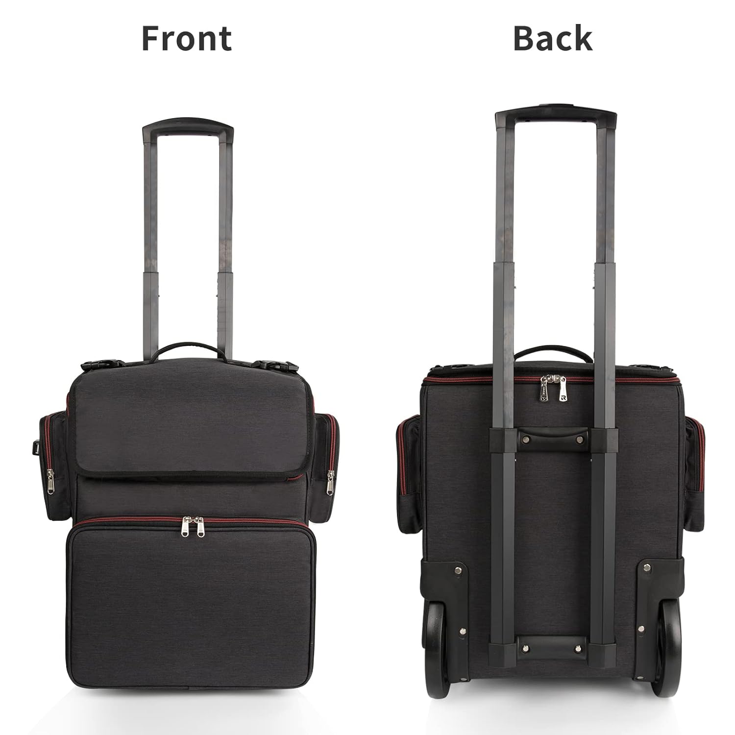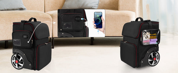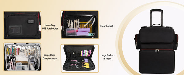 - Thoughtful Details Design - Hairstylist traveling case has following unique 1.the transparent detachable pouch can be taken off and placed on the tabletop.2. A dust-proof wheel pad prevents the tabletop from getting dirty. 3.the zipper is designed with a small zipper lock. 4.Name tag or business card can be placed in the side pouch, 5.external USB charging port and built in charging cable, offers you a convenient way to charge your Electronic accessories while traveling