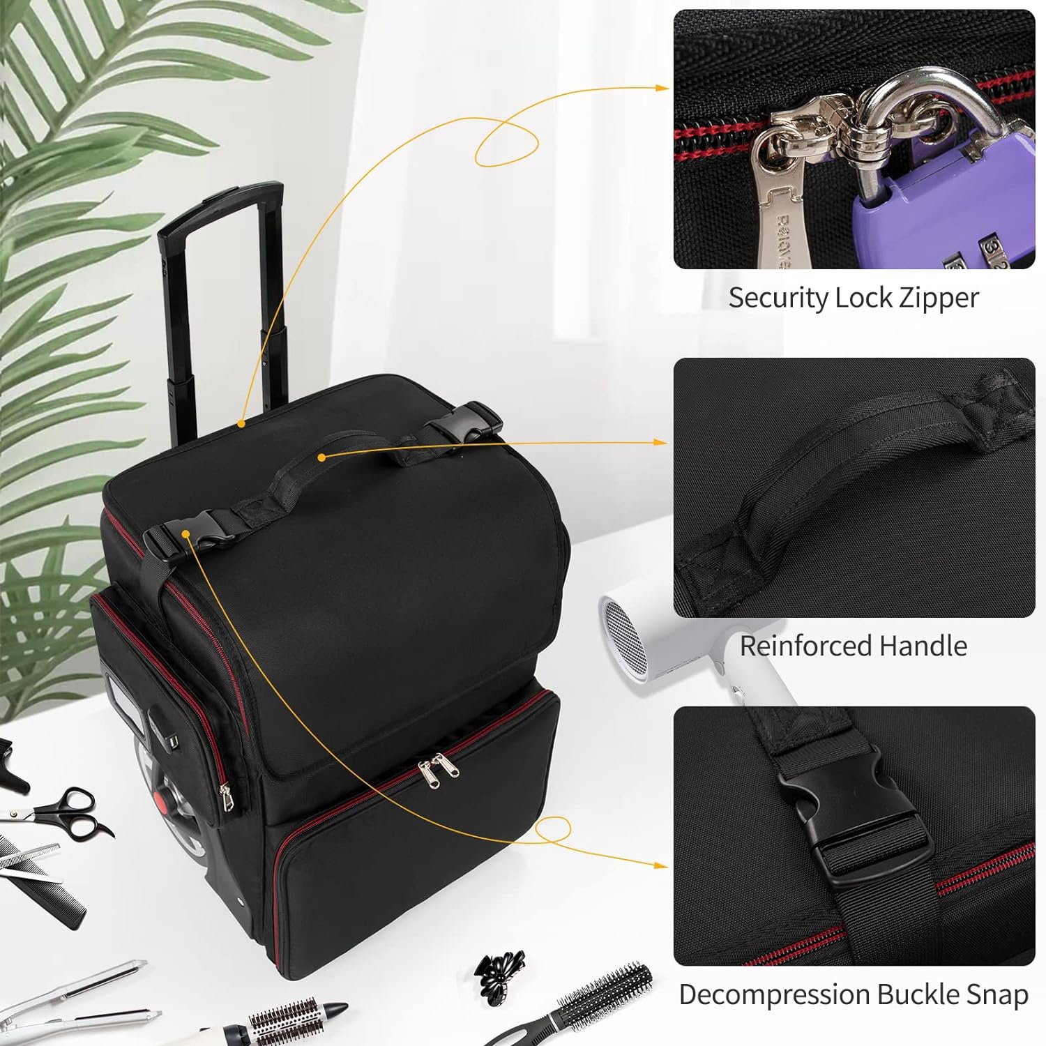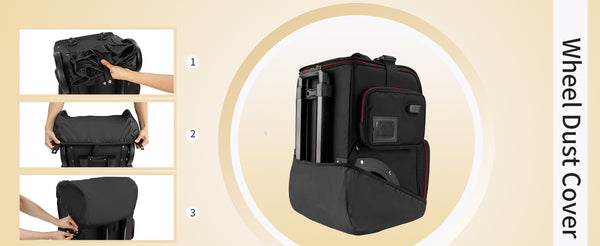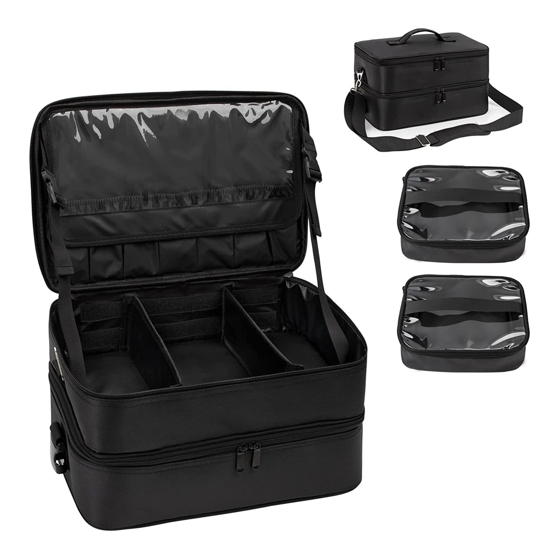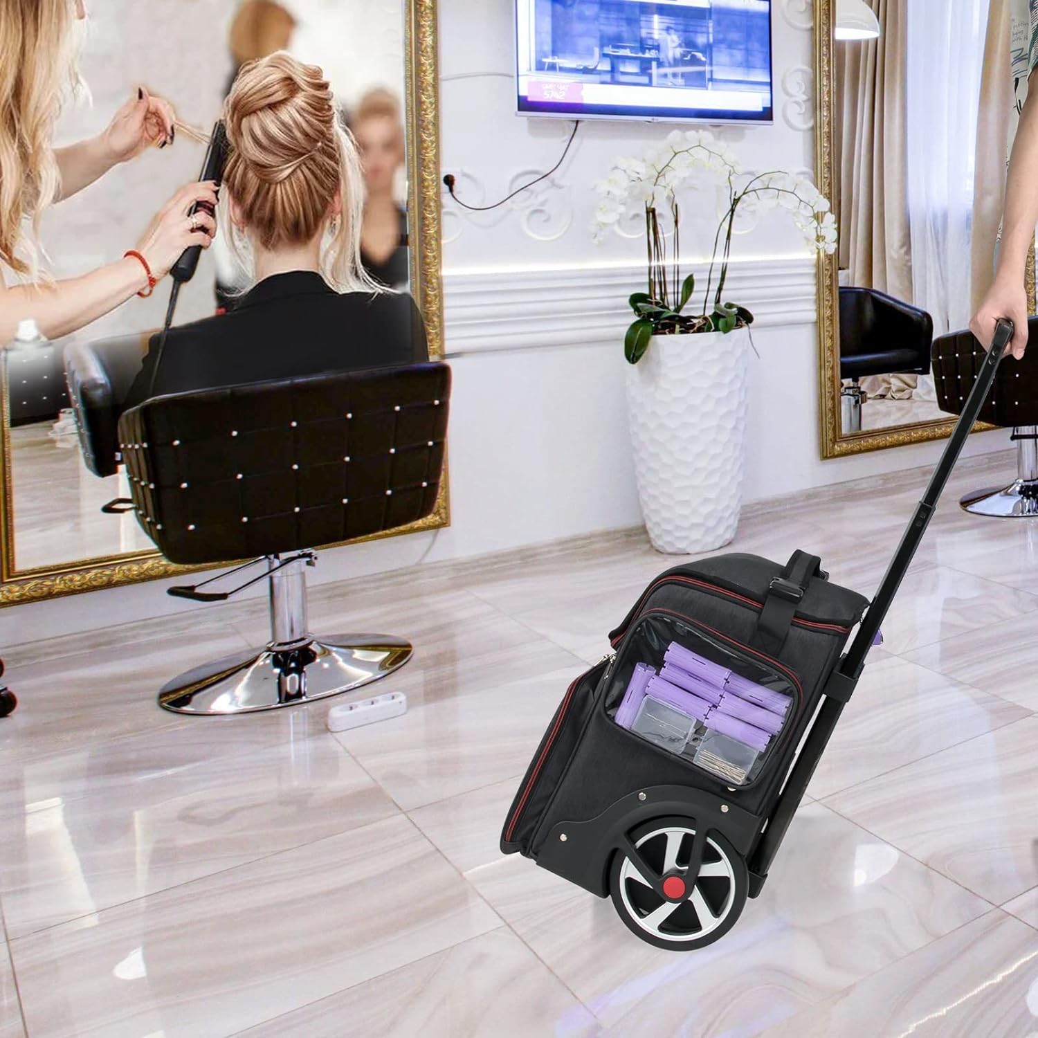 - Thoughtful Details Design - Hairstylist traveling case has following unique 1.the transparent detachable pouch can be taken off and placed on the tabletop.2. A dust-proof wheel pad prevents the tabletop from getting dirty. 3.the zipper is designed with a small zipper lock. 4.Name tag or business card can be placed in the side pouch, 5.external USB charging port and built in charging cable, offers you a convenient way to charge your Electronic accessories while traveling