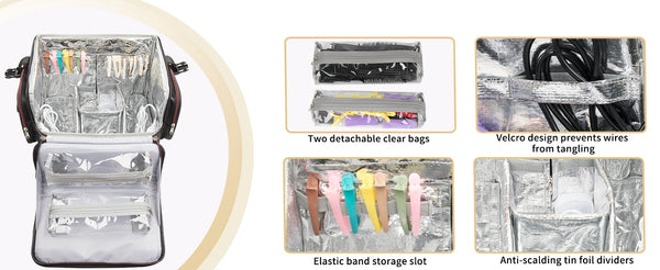 The hairdressing toolbox is made of waterproof fabric, which can well protect the contents inside. The inner sewed with a full tin foil anti-scalding lining,cuts off the hot high temperature, and protects the internal items and the cosmetic case. The metal two-way zipper can make the switch smoother and easier to use.