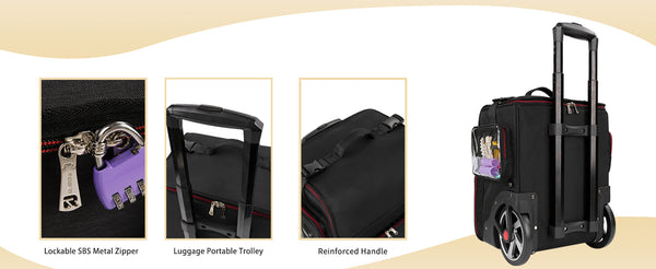 - Durable & Light Weight - Our Rolling Makeup Case with wheels, made of 1680D oxford nylon fabric for wear-resistance and not easy to scratch. The sturdy and smooth metal zipper is more textured and durable. the makeup case‘s h’andle with two pressure relief snaps allows it can withstand more pressure