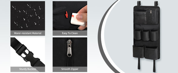 - High Quality Material: The makeup chair storage bag is made of premium oxford fabric and thick transparent PVC, with waterproof lining inside the pockets, easy to clean. Sturdy buckles and adjustable fastening straps, easily attaches to makeup chairs. Reinforced stitching, makes it durable enough to withstand heavy weight.