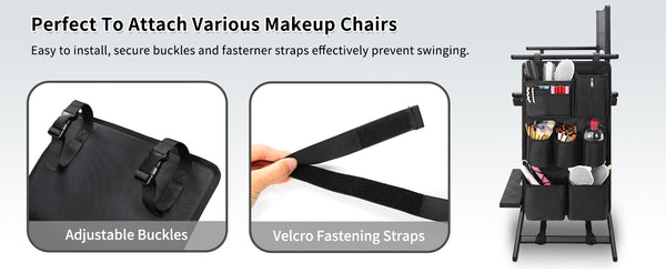 - Easy To Install: This makeup chair bag is equipped with two adjustable buckles and fastening straps, easy to install on various makeup chairs. The upper adjustment buckles is fixed to the side armrest of the makeup chair, below velcro straps is fixed to the chair legs to effectively prevent swinging, it can be wrapped one or more times as needed. Easy to use, no assembly required.