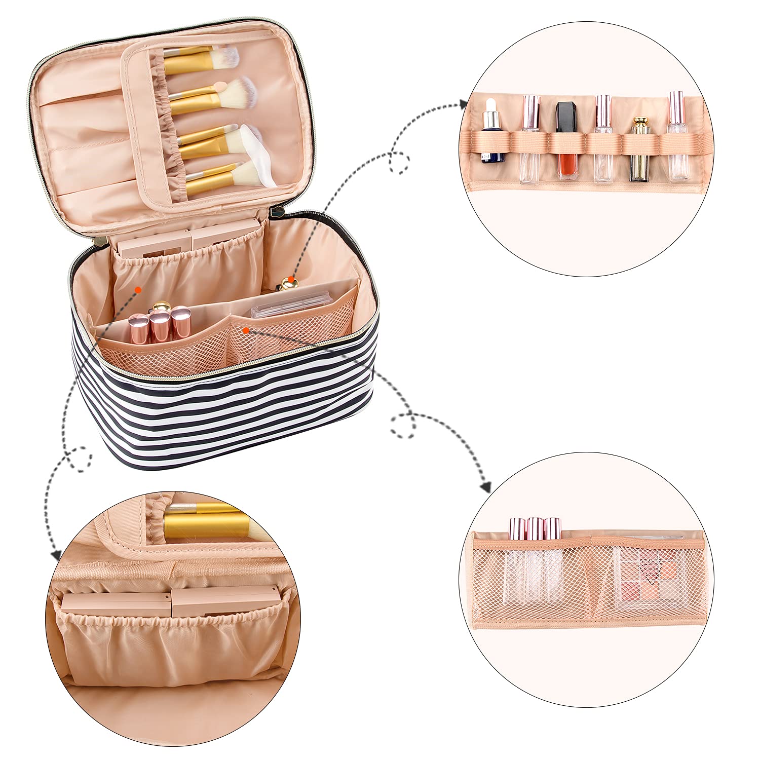 Large Portable Makeup Bag with Toiletries Brushes Slots and Divider-Large Black/White Stripes