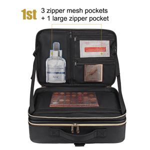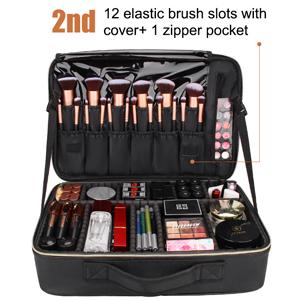 - LARGE CAPACITY: This bag have two layer to store cosmetic or makeup tools. The first layer have three mesh pocket to store facial mask and so on. A large zipper pocket to store full-sized eyeshadow palette. The second layer have a zipper pocket to store palette things. Twelve elastic slots used to store a series of makeup brushes, big or small. The main compartment can store your cosmetics with full-sized. And it have ten dividers to organize your cosmetics.