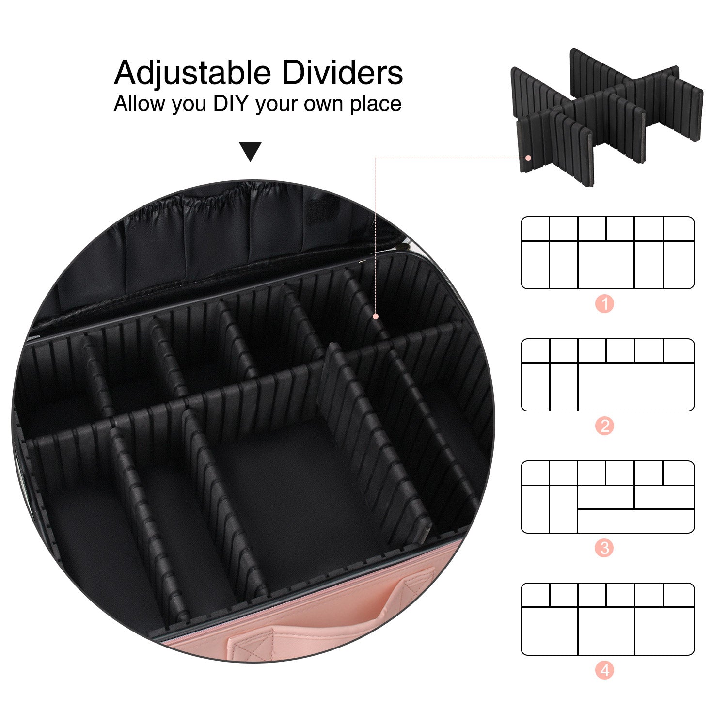 - Flexible Adjustable Dividers: Main compartment includes 10 adjustable EVA dividers, you can DIY your needed slots, more flexible use of space to fit different cosmetics in and keep them perfectly separated and organized without shifting places.
