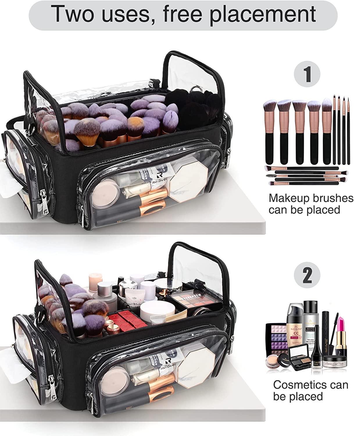 Makeup Brush Case, Extra Large Makeup Brush Holder Professional Makeup Artist Travel Case Clear Waterproof Cosmetic Organizer Bag, Full Open Easy to Access, with Adjustable Strap and Dividers