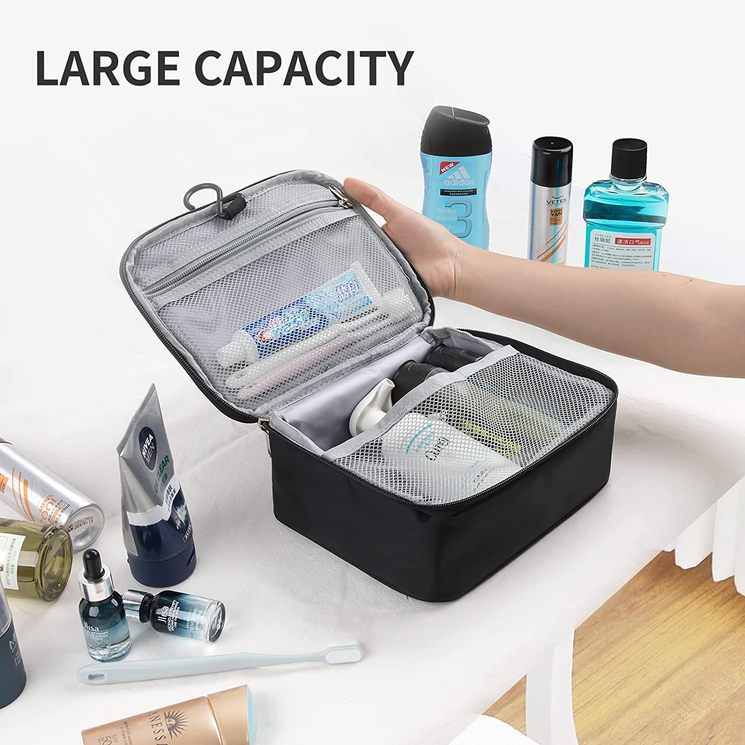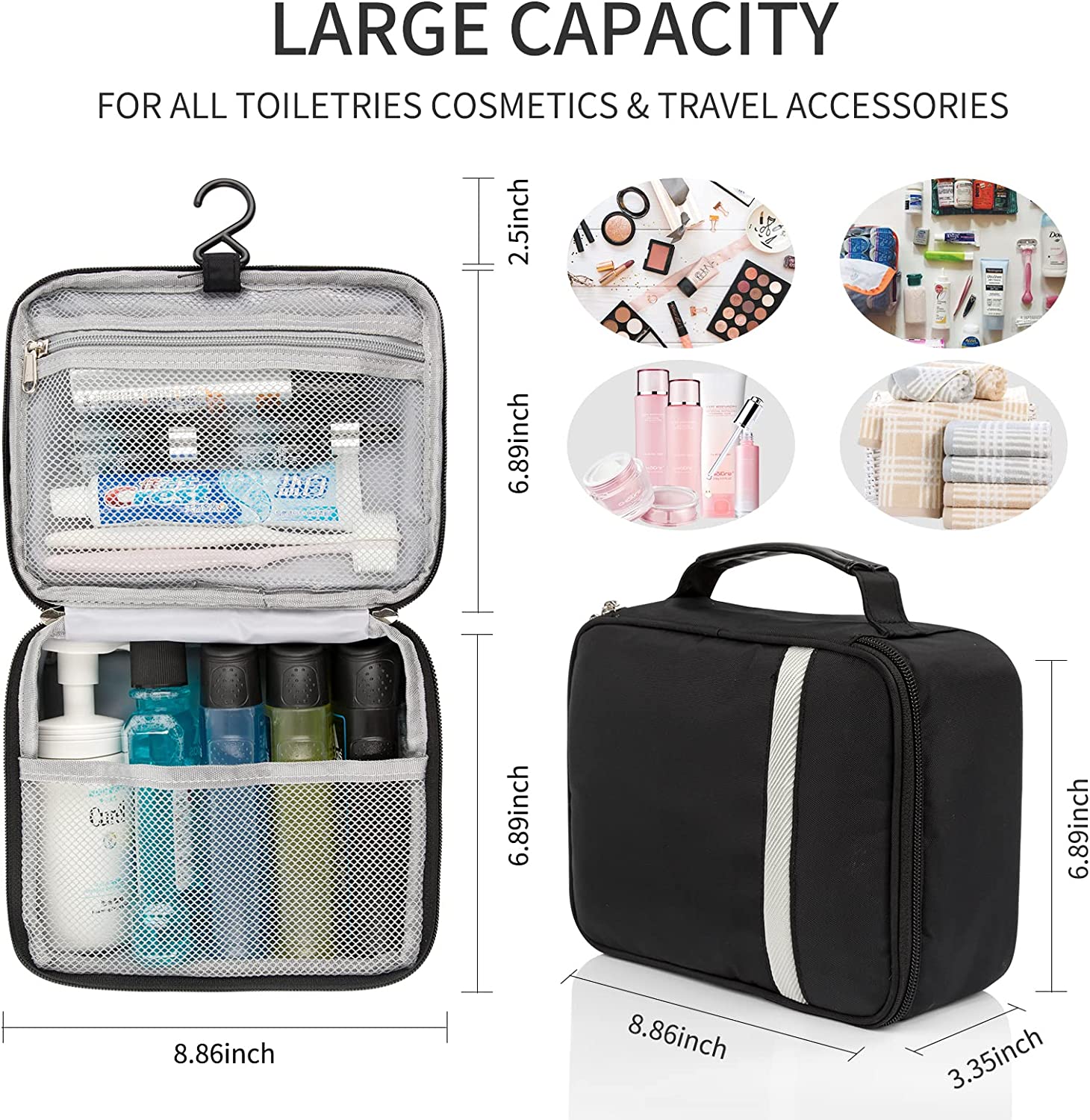 • ☑ Large Capacity & Organized Compartments —— Size 8.8×6.8×3.3 inch | 22.5×17.5×8.5cm. The main compartment which is roomy to fit facial cleanser, electric shaver, travel shampoo, and other toiletries. It also has one large mesh pocket with a zipper to store all of your little toiletries without getting disorganized and easy to find.
