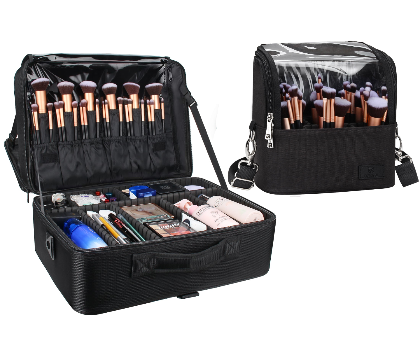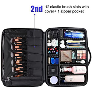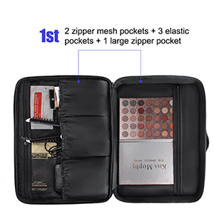 - Roomy And Multi-Compartments: The extra large makeup bag has 2 specific layers. First layer: 3 elastic pockets and 2 zippered mesh pockets for hair curler hair straightener, makeup brush, makeup tools, etc. One large zippered mesh bag for the eyeshadow palette. Second layer: 12 elastic makeup brush slots with a plastic cover and hold about 40 pcs brushes give all your brushes a safe "home". (Excluded mirror and makeup accessories)
