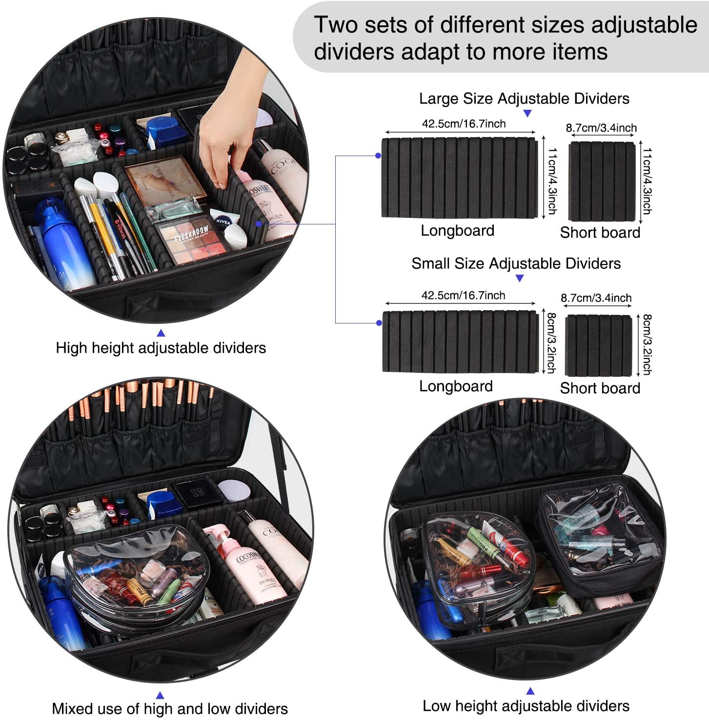 - Two Sets of Adjustable Dividers: The extra large makeup bag comes with two sets of different height-adjustable dividers. It can be flexible with use. DIY your makeup case organizer with adjustable padded dividers. You can design internal compartments by the adjustable padded dividers. Multi-movable Partition gives your freedom to arrange the space.