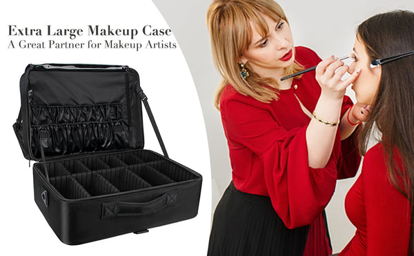 - Largest Among Similar Makeup Train Case: Extra Large size 16.3" x 12.4" x 7" / 41cm*31.5cm*18cm. Multi-Functional makeup artist box perfect for any occasion, It can be used as a Personal makeup case organizer, professional makeup artist box, as a handbag with a belt to carry on the shoulder, and as makeup trolley case.